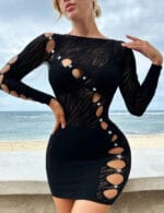 Vestido manga larga de malla para mujer, con aberturas y pedrería.
